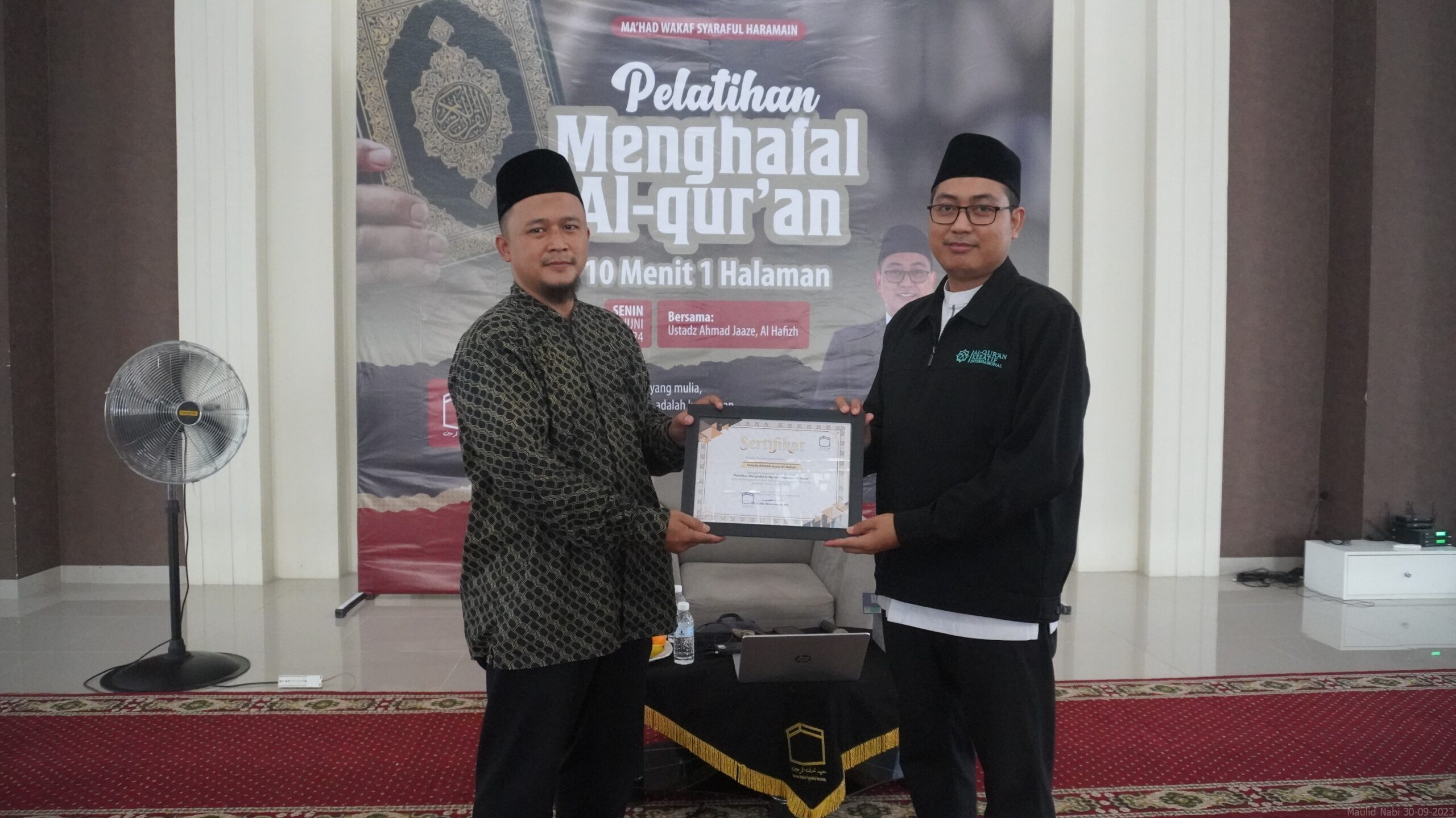 Mahad Wakaf Syaraful Haramain menyelenggarakan Pelatihan Menghafal Al-Quran: 10 Menit 1 Halaman pada hari Senin, 3 Juni 2024 kemarin. Acara ini menampilkan Ustadz Ahmad Jaaze Al Hafizh, seorang pembimbing Al-Quran terkemuka, yang membimbing santri melalui metode efektif untuk meningkatkan kemampuan menghafal Al-Quran para santri. Acara ini diselenggarakan dalam rangka untuk membantu santri mencapai target hafalannya sebelum liburan. Selain diikuti oleh seluruh santri, pelatihan ini juga dihadiri oleh para asatidz dan ustadzat Program Kulliyatul Aimmati Wal Huffazh. Ustadz Ahmad Jaaze Al Hafizh dalam pelatihan tersebut menyampaikan bahwa untuk menghafal al Qur’an perlu kesungguhan tekad dan persiapan yang harus dilakukan. Diantara persiapan itu adalah mempersiapkan kondisi fisik tubuh kita agar bisa fokus lama dan nyaman dalam menghafal. Beliau juga menyampaikan, agar hafalan mutqin maka harus senantiasa murajaah dan dibawa dalam sholat, sehingga kita menjadi dekat dengan Al Qur’an.