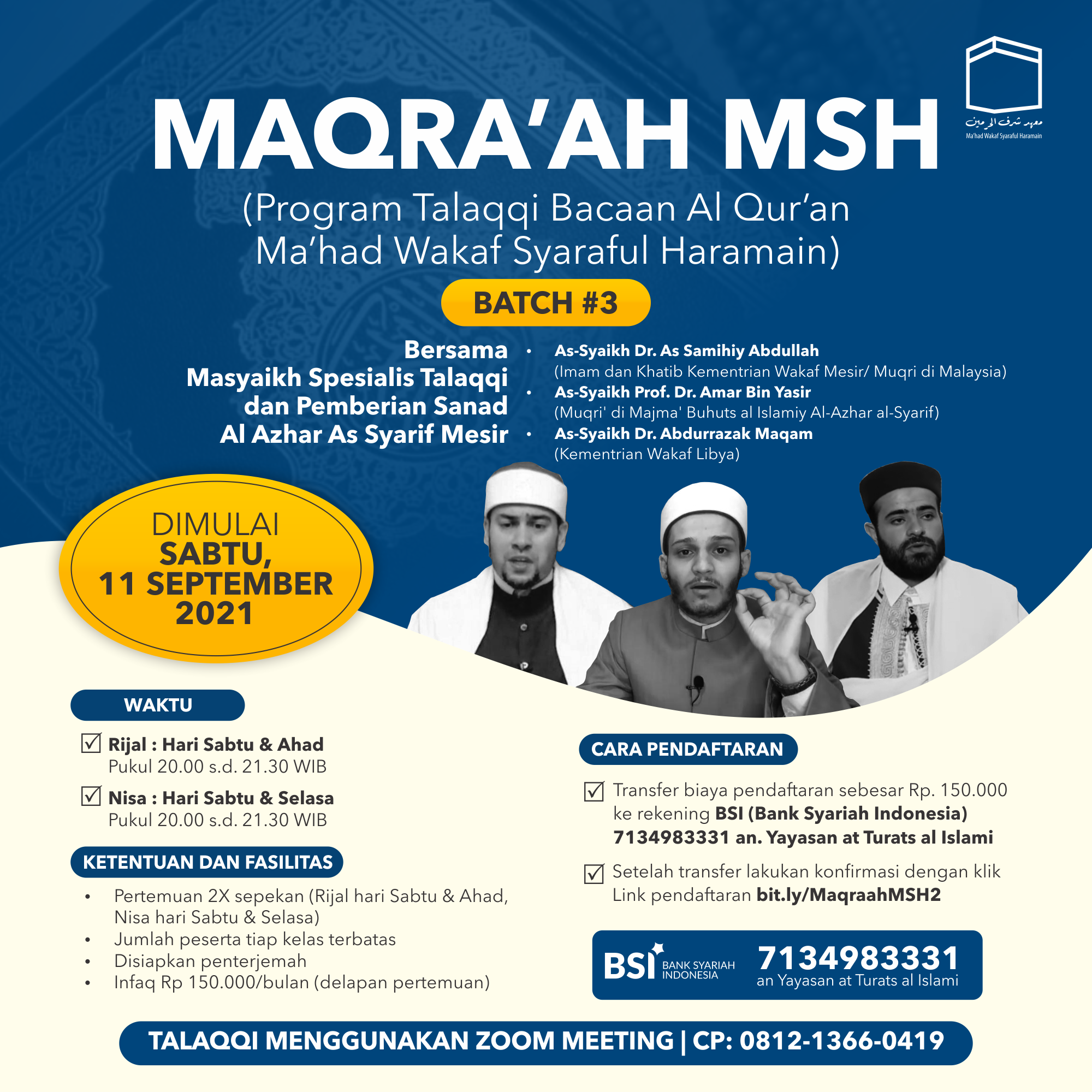 Daftar via link https://bit.ly/MaqraahMSH2 dengan transfer terlebih dulu ke Bank Syariah Indonesia (BSI) Rek. 7134983331 an Yayasan at Turats al Islami.